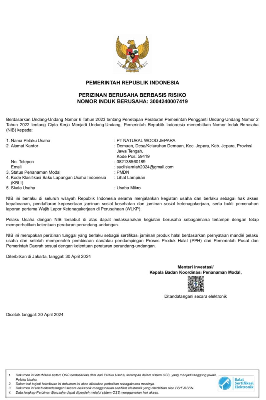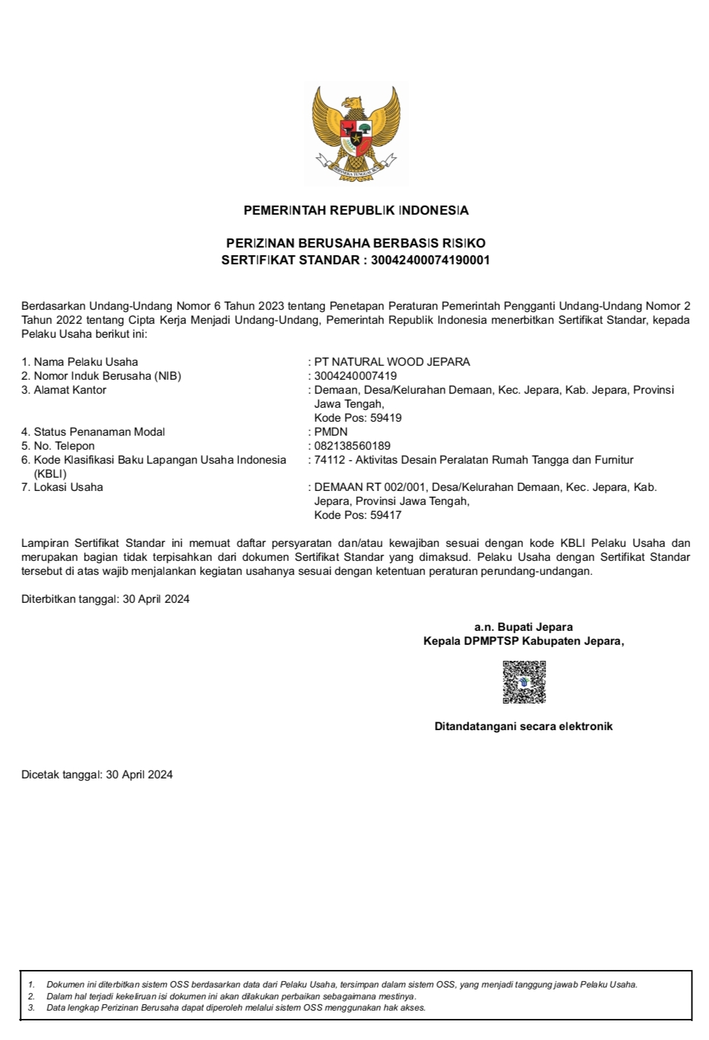 Izin Usaha Sebagai Wujud Nyata Menjadi Warga Negara Yang Baik, Natural Wood Jepara Ikut Berperan Serta Aktif Mengikuti Regulasi Perijinan Yang Ditetapkan Oleh Pemerintah. Perusahaan Ini Tercatat Dalam Kemenperindag Dengan Keluarnya Kemenkumham, Sertifikat Standar & Nomor Induk Berusaha (NIB).