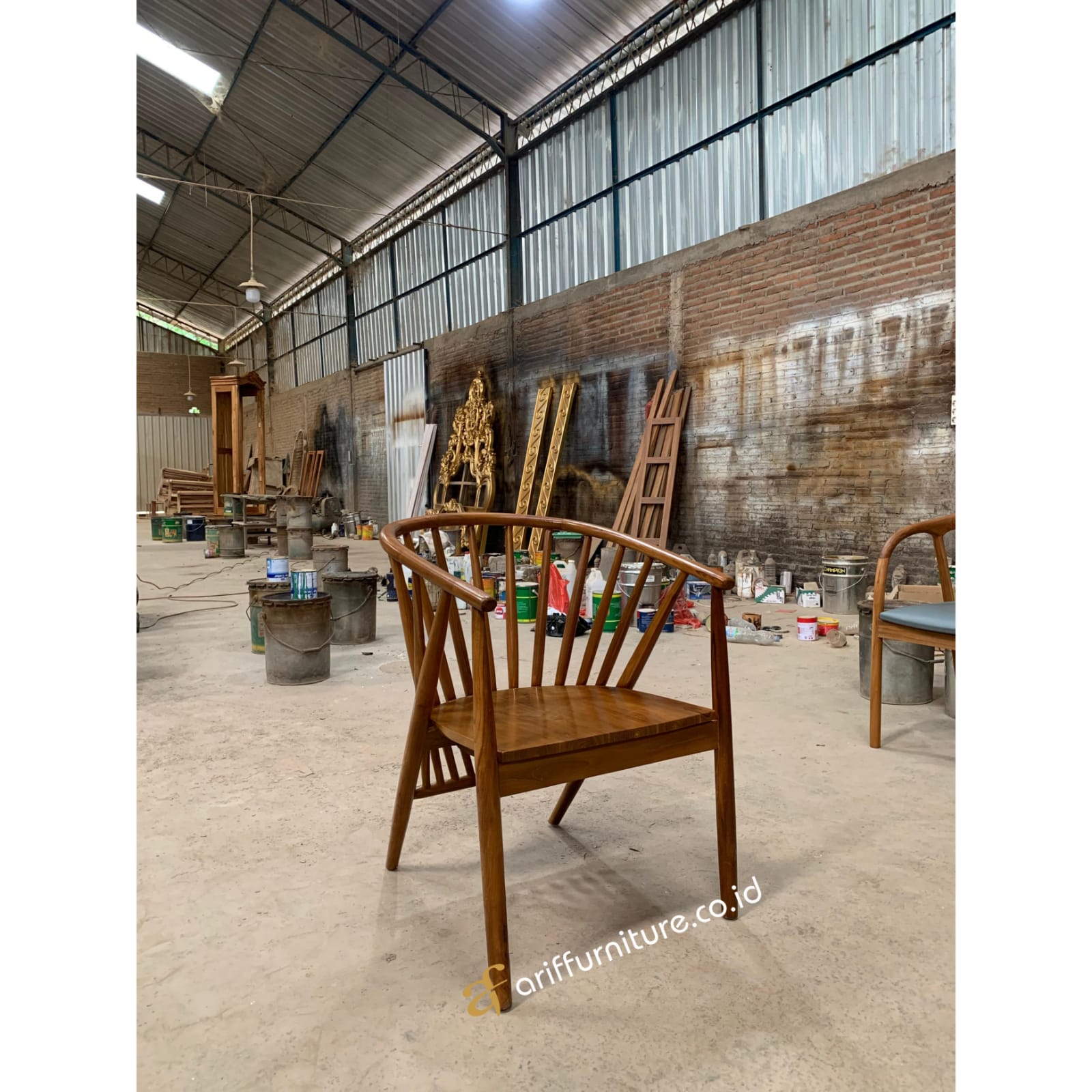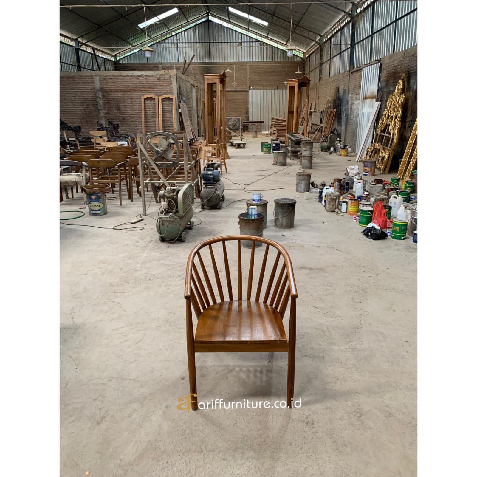 Desain kursi cafe kayu dengan sandar jari-jari minimalis modern ini tidak hanya memenuhi kebutuhan fungsional, tetapi juga menjadi fokus perhatian di ruangan. Keunikan desainnya mampu menarik perhatian pelanggan dan menciptakan suasana yang hangat dan menyenangkan di area cafe atau ruang tunggu. Dengan ergonomi yang dipertimbangkan secara cermat, kursi ini memastikan kenyamanan bagi penggunanya dalam jangka waktu yang lama, menjadikannya pilihan yang ideal untuk lingkungan yang ramai dan sering digunakan.