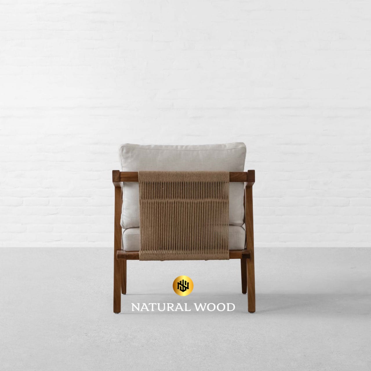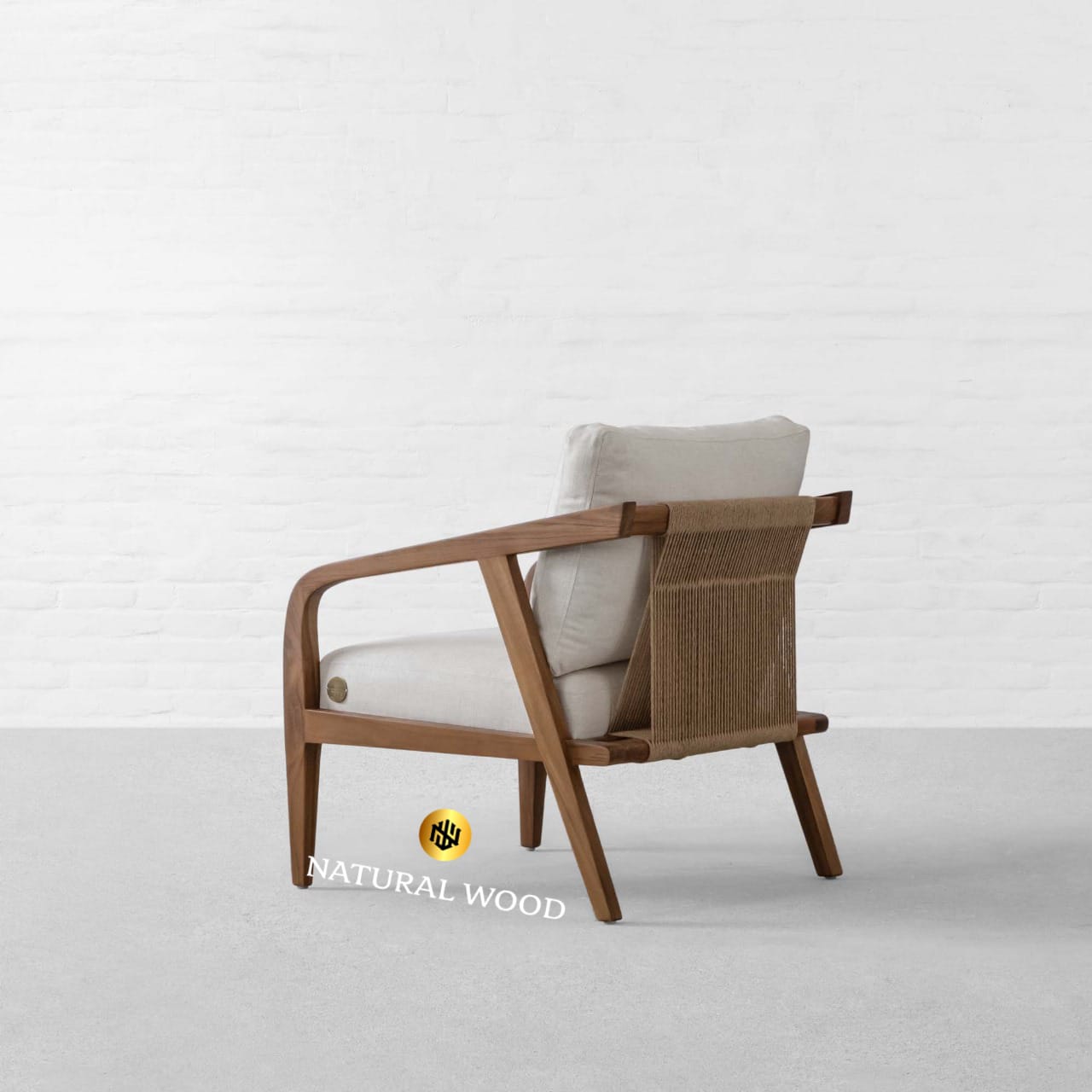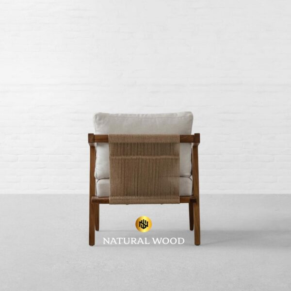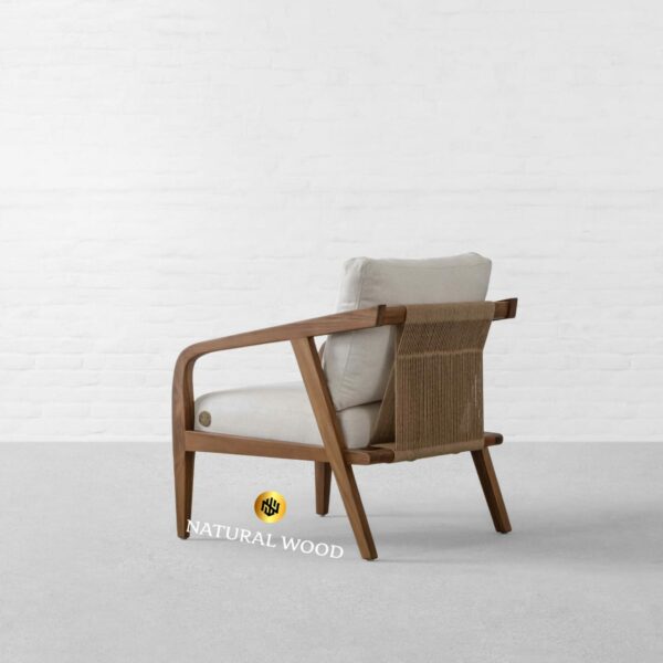 Anyaman tali Lum yang dipasang dengan teliti pada bagian dudukan dan sandaran. Anyaman tali ini memberikan sentuhan artistik yang unik dan menambah dimensi visual pada kursi, menciptakan kontras yang menarik dengan kayu jati yang polos.