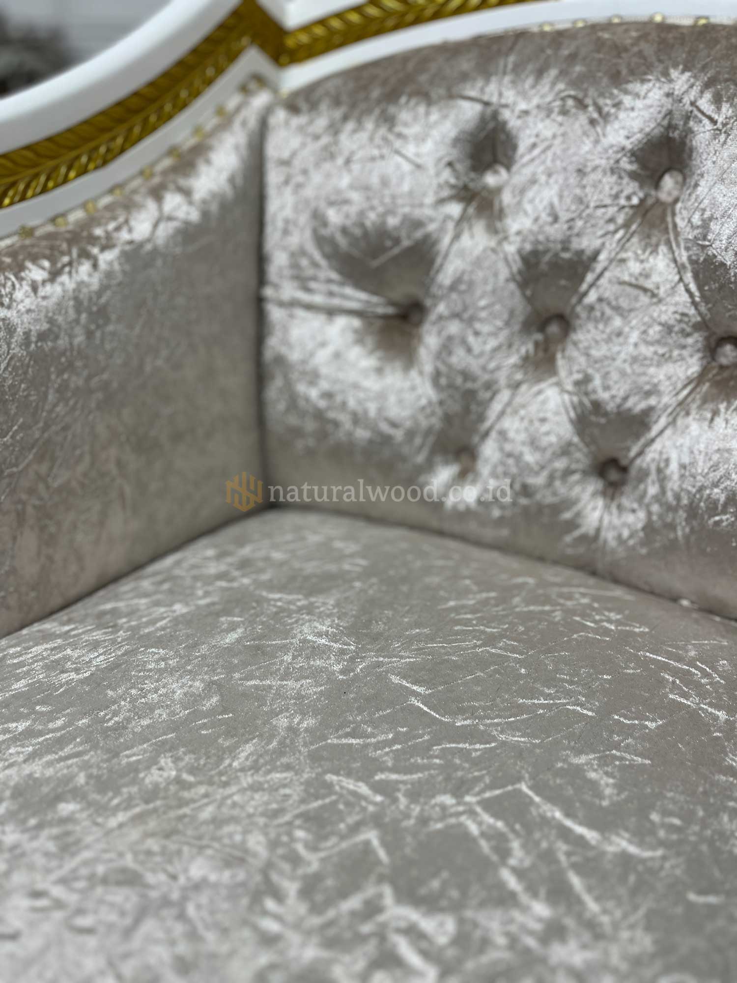 Dilengkapi dengan dua kursi empuk berbalut kain beludru lembut dan satu meja kayu kokoh, set ini tidak hanya memanjakan mata tetapi juga memberikan kenyamanan maksimal. Dudukan ergonomisnya mendukung postur tubuh dengan baik, cocok untuk menikmati waktu santai bersama keluarga atau tamu.