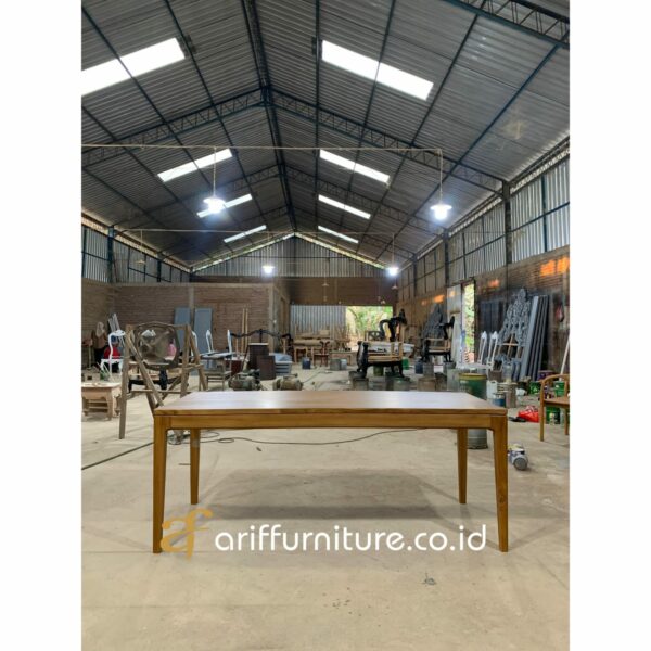 Desain minimalis dari meja makan ini memastikan keanggunan dalam kesederhanaan. Garis-garis bersih dan bentuk yang sederhana memberikan kesan elegan dan modern yang cocok untuk berbagai gaya dekorasi interior. Meja makan ini tidak hanya menghadirkan fungsi praktis dalam menyajikan makanan, tetapi juga menjadi titik fokus visual yang menarik dalam ruang makan.