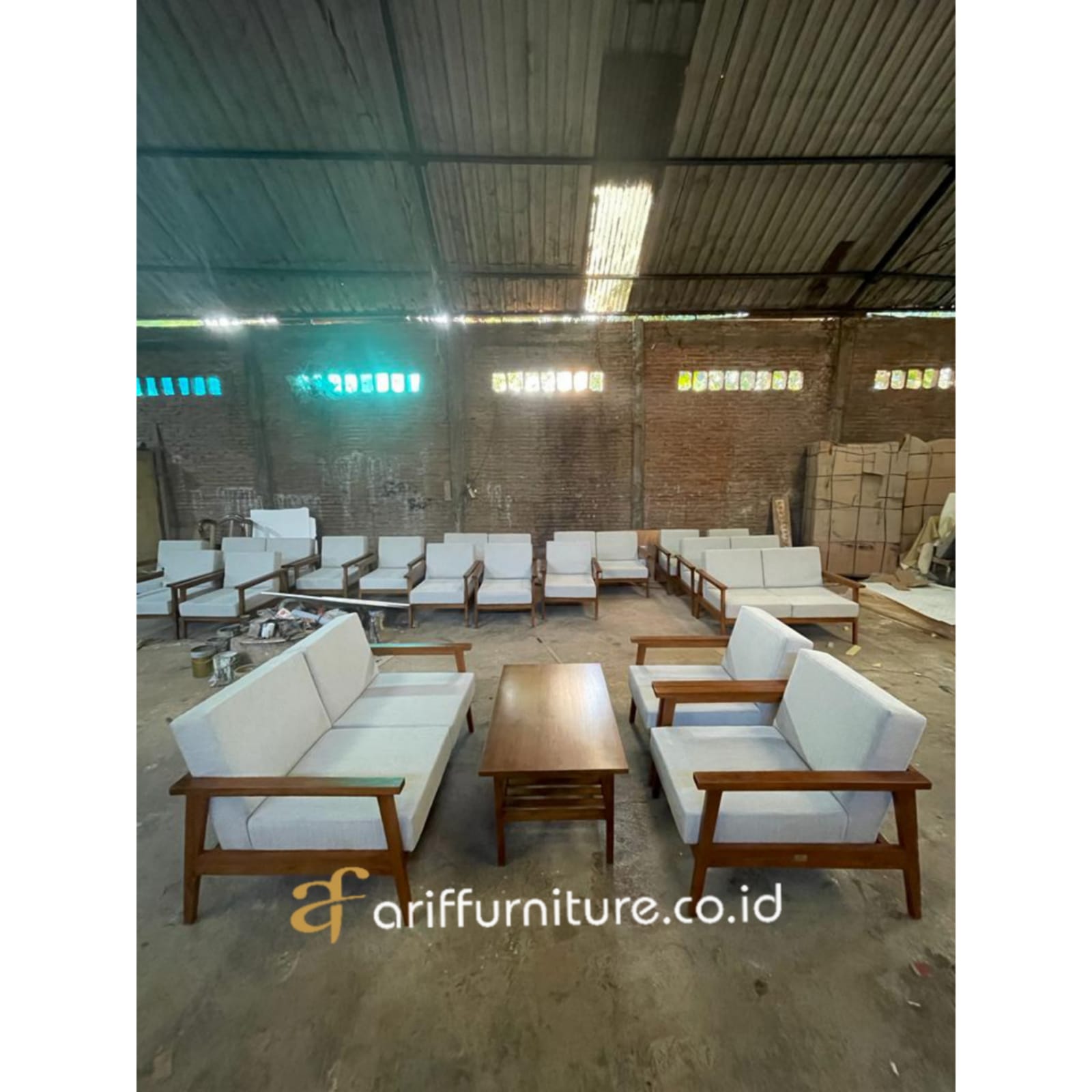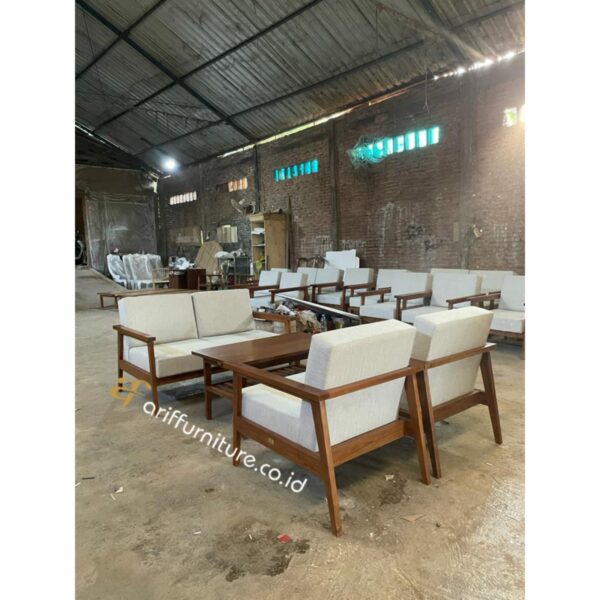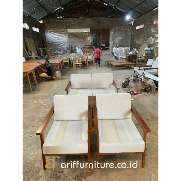 Kursi sofa minimalis kayu jati tidak hanya menambahkan sentuhan alami ke dalam ruangan, tetapi juga memberikan suasana yang hangat dan ramah bagi pengunjung kafe. Desainnya yang bersih, sederhana, dan elegan membuatnya mudah dipadukan dengan berbagai gaya dekorasi interior. Kualitas kayu jati yang tahan lama juga memberikan nilai tambah dalam hal keawetan dan daya tahan, sehingga kursi sofa ini dapat bertahan lama bahkan dengan penggunaan yang intensif.