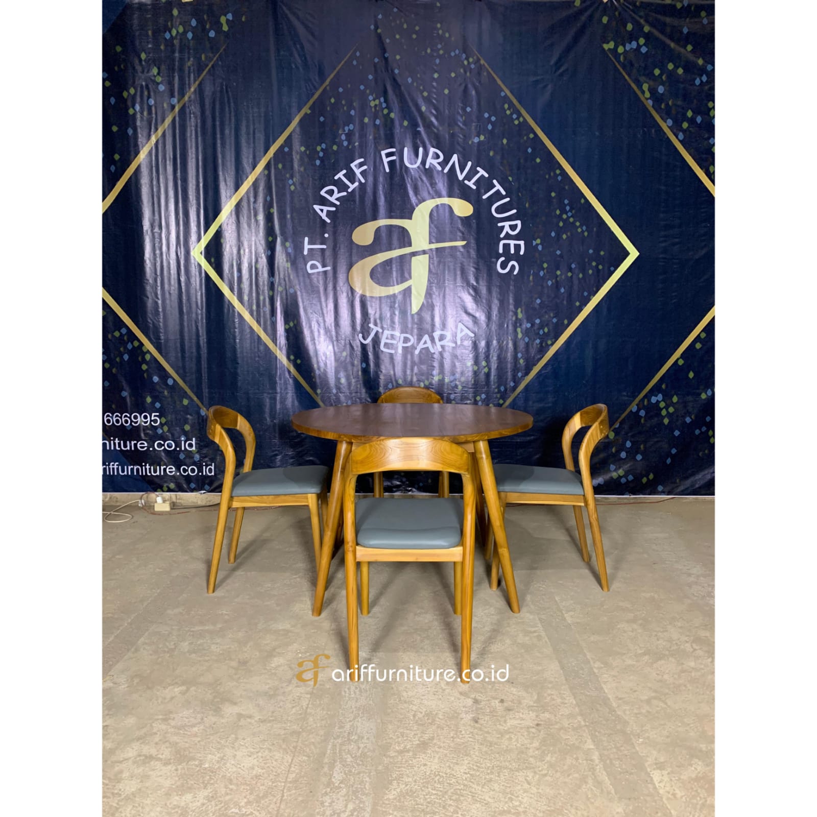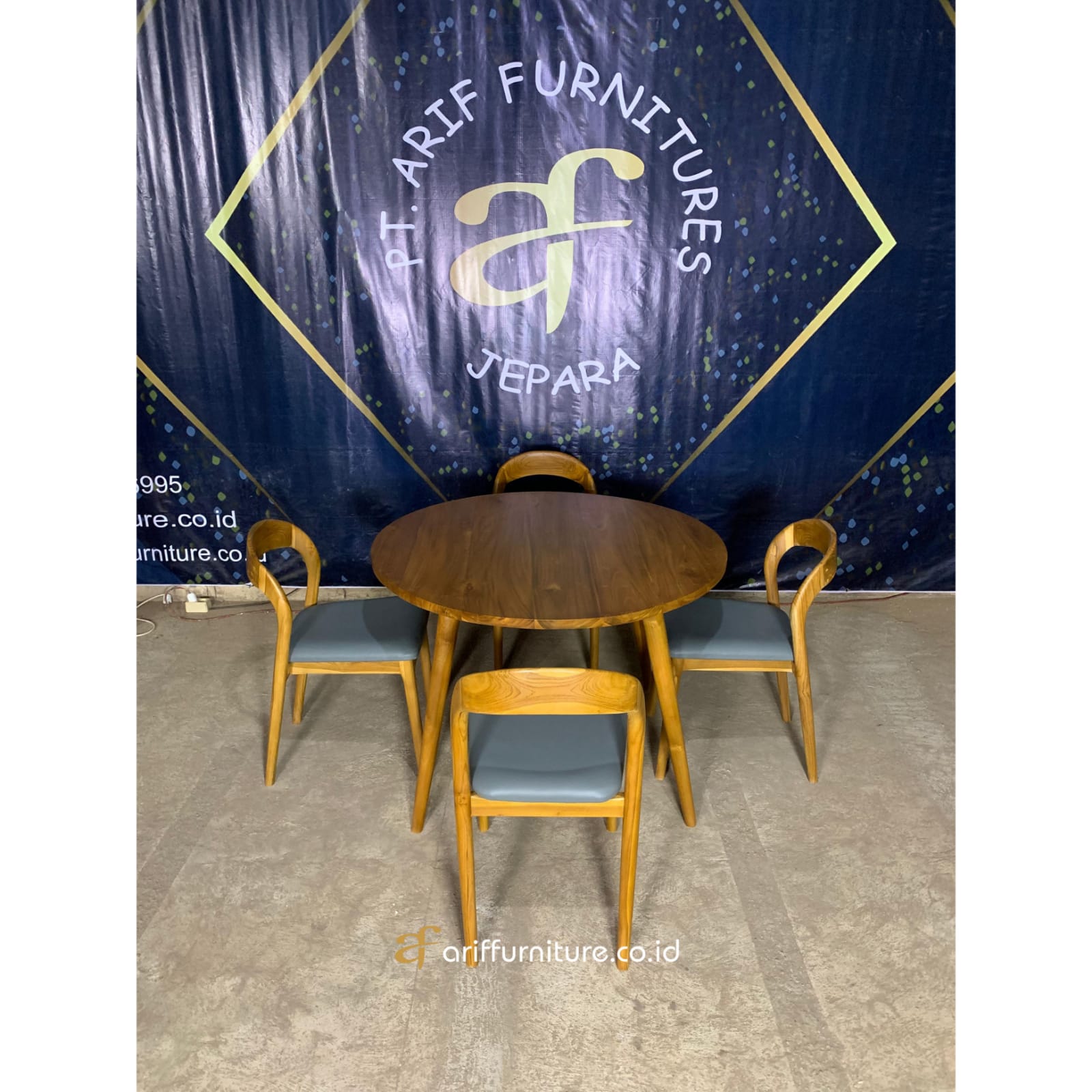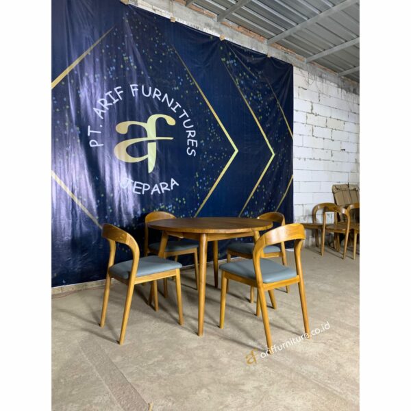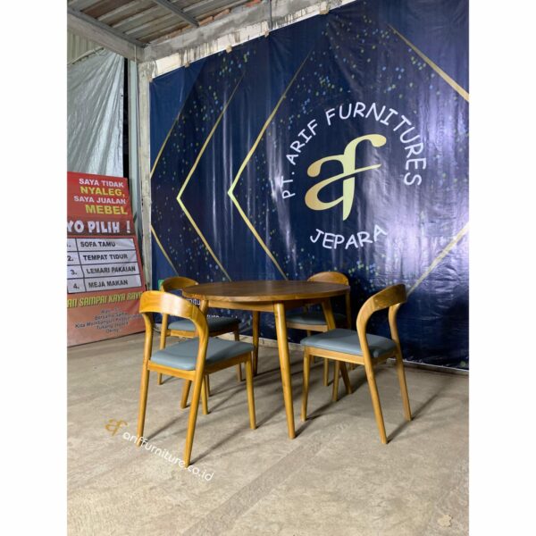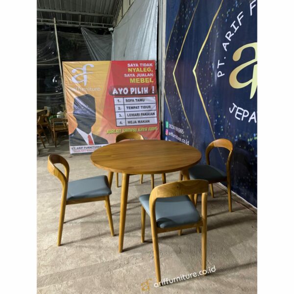Kombinasi dari set meja bulat kayu jati dan kursi sandaran lengkung dengan jok busa menciptakan suasana kafe yang hangat, ramah, dan nyaman. Pengunjung dapat menikmati suasana santai sambil menikmati minuman favorit mereka sambil duduk dengan nyaman di kursi yang didesain dengan baik. Furnitur ini tidak hanya berfungsi sebagai perabotan fungsional, tetapi juga menambah daya tarik visual yang memikat untuk menarik pelanggan kembali lagi.