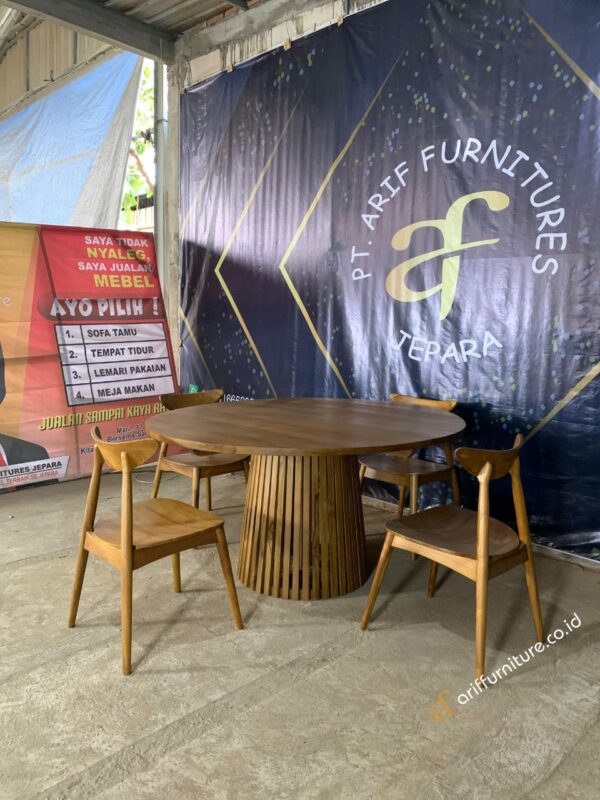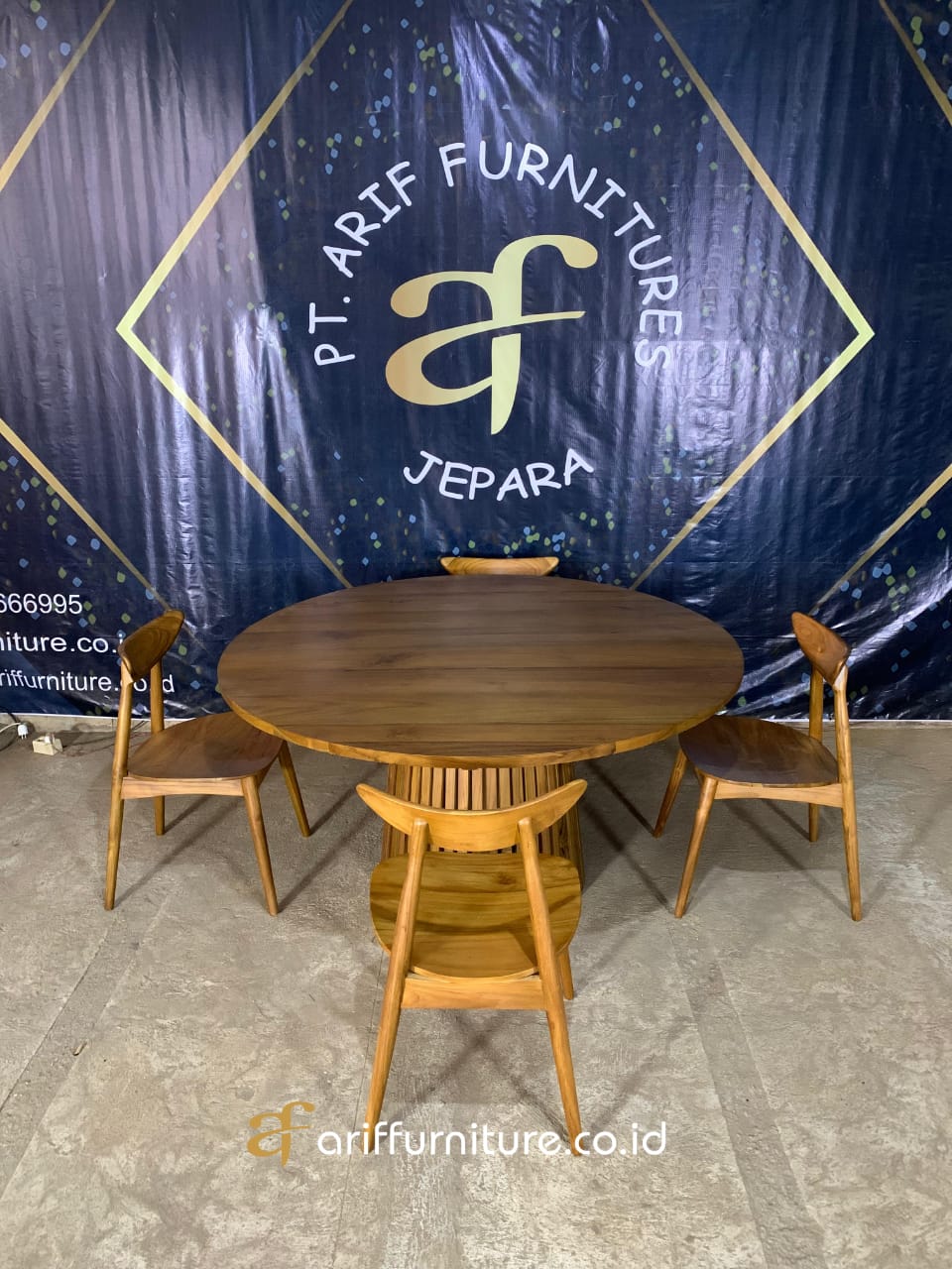 Elegansi Retro dalam Meja Makan Cafe Bundar Scandinavian dengan Set Kursi Sandaran Bulan Sabit