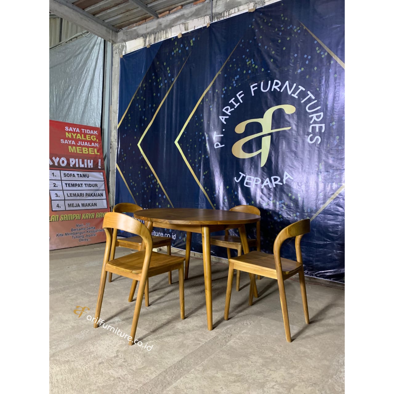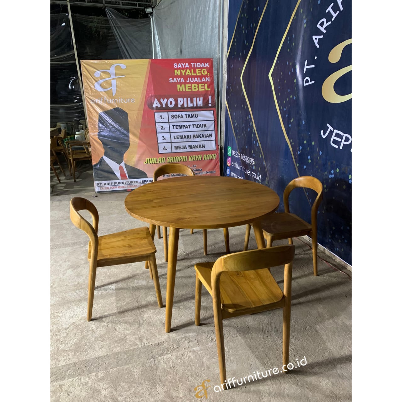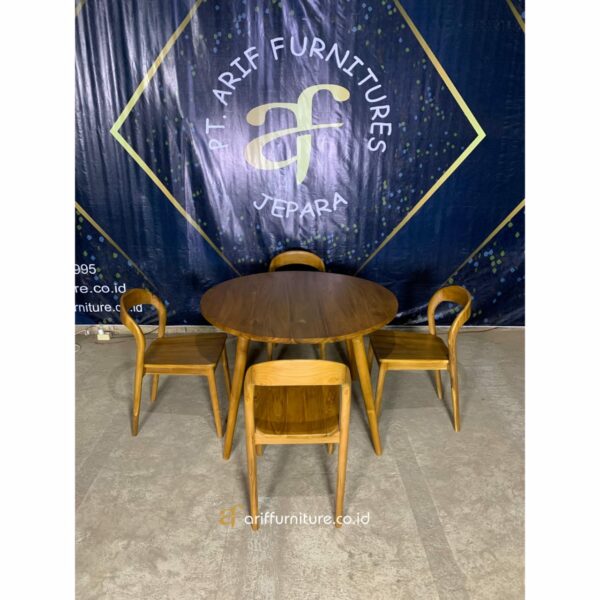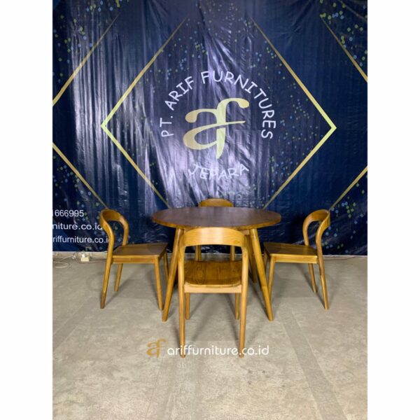 Ketika berbicara tentang furnitur, kayu jati telah lama diakui karena keindahannya yang alami dan ketahanannya yang luar biasa. Tidak hanya itu, kursi sandaran lengkung yang ergonomis dan meja makan minimalis menambah sentuhan yang elegan dan modern pada interior ruang makan. Kedua elemen ini menyatukan keindahan alami dan gaya minimalis yang memikat, menjadikannya pilihan ideal bagi para pemilik kafe dan restoran yang mengutamakan kenyamanan dan keanggunan.