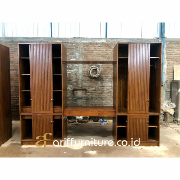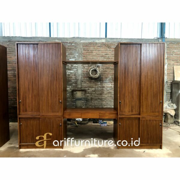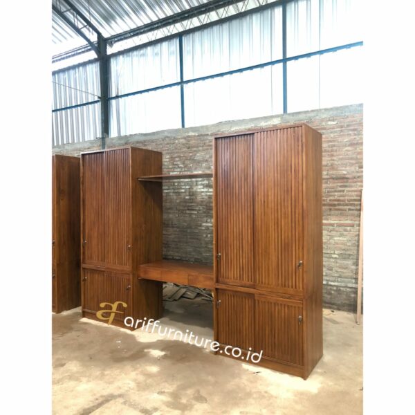 Dua elemen penting dalam dekorasi ruang tidur yang mengusung filosofi ini adalah lemari baju dan meja rias minimalis. Desain minimalis pada lemari baju dan meja rias menekankan fungsi dan estetika yang bersih dan sederhana. Lemari baju minimalis biasanya memiliki garis-garis lurus, warna netral, dan kesederhanaan dalam detail. Material yang digunakan cenderung adalah kayu ringan atau logam, memberikan kesan ruang yang lapang dan terorganisir.