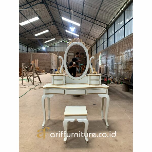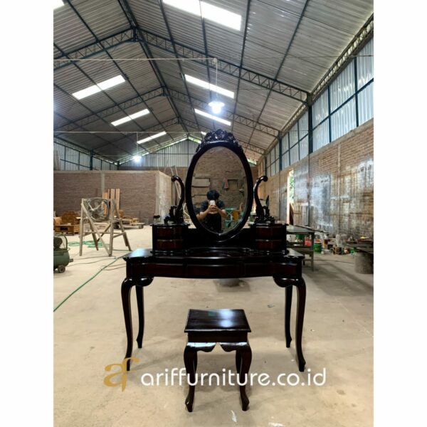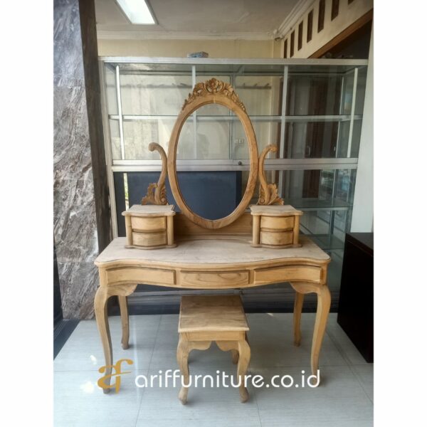 Salah satu perabotan yang tak hanya memancarkan keindahan, tetapi juga menambah nuansa elegan dalam sebuah ruangan. Dengan desainnya yang khas dan ciri klasik yang timeless, meja rias ini telah menjadi ikon gaya dalam dekorasi interior. Gaya ini telah memenangkan hati banyak pecinta seni dan desain. Dari pahatan indah pada kayu yang dipadu dengan sentuhan artistik, hingga penggunaan aksen-aksen emas atau perak yang melengkapi kemegahan dari meja rias ini.