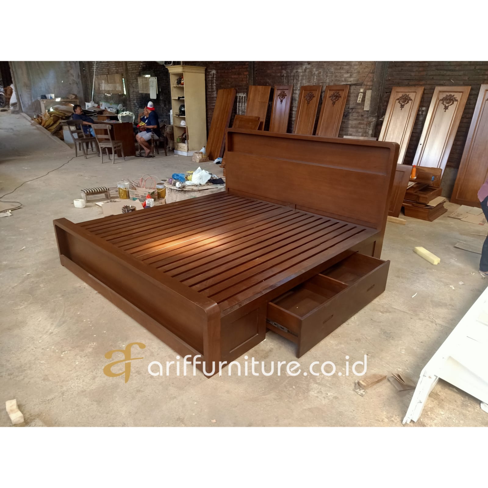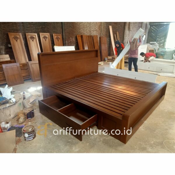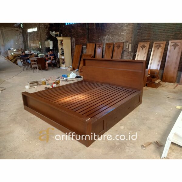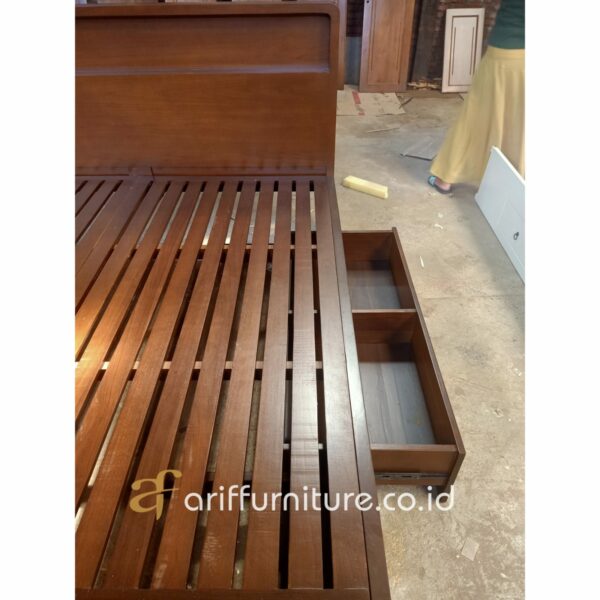 Tidak hanya itu, ranjang dipan kayu jati minimalis modern dengan laci 2 juga menghadirkan fleksibilitas dalam desain interior. Dapat dengan mudah diintegrasikan ke dalam berbagai gaya dekorasi kamar tidur, baik itu modern, minimalis, maupun gaya kontemporer. Ranjang ini juga dapat berfungsi sebagai pernyataan artistik yang menarik perhatian tanpa mengurangi kenyamanan.