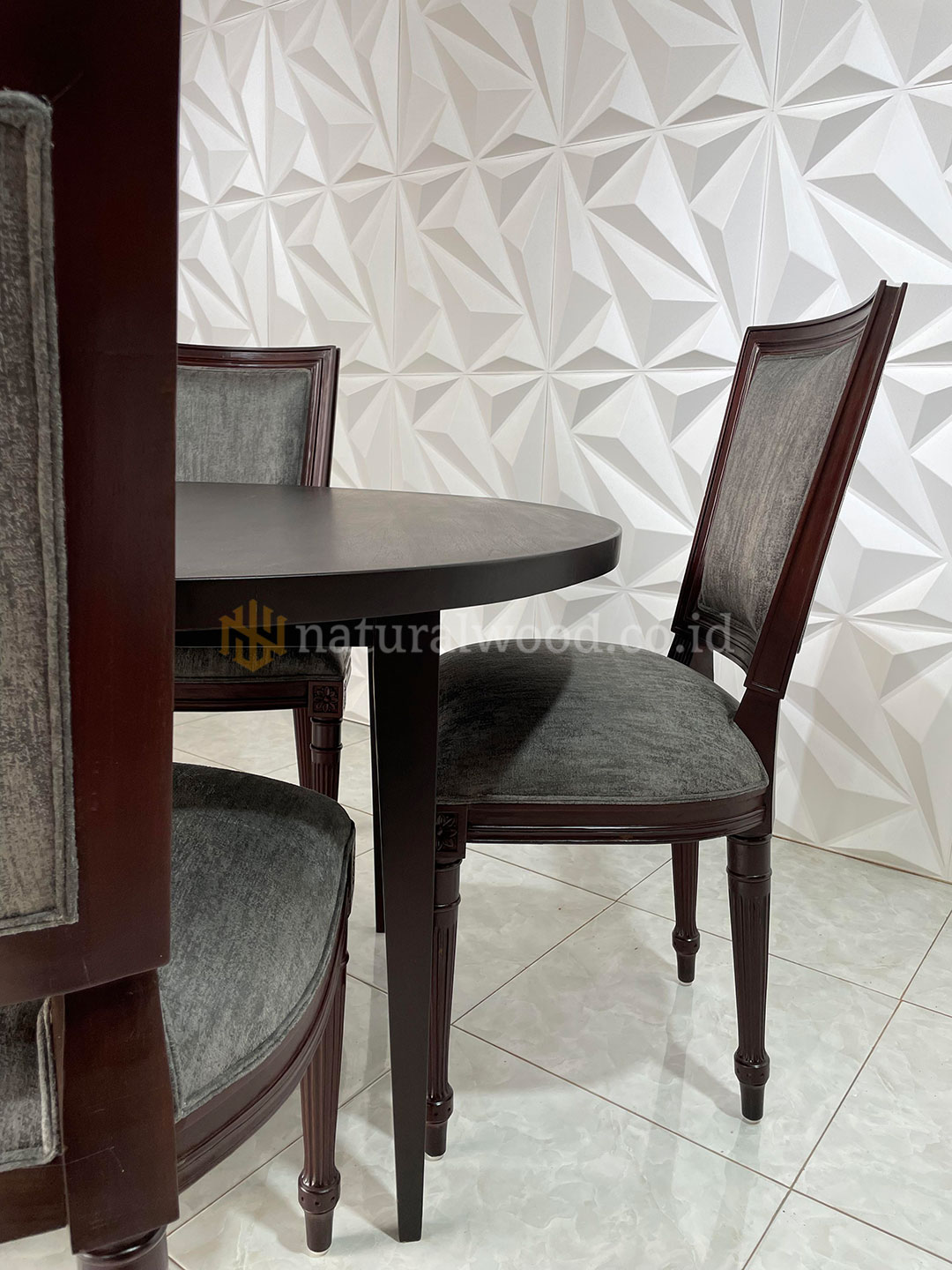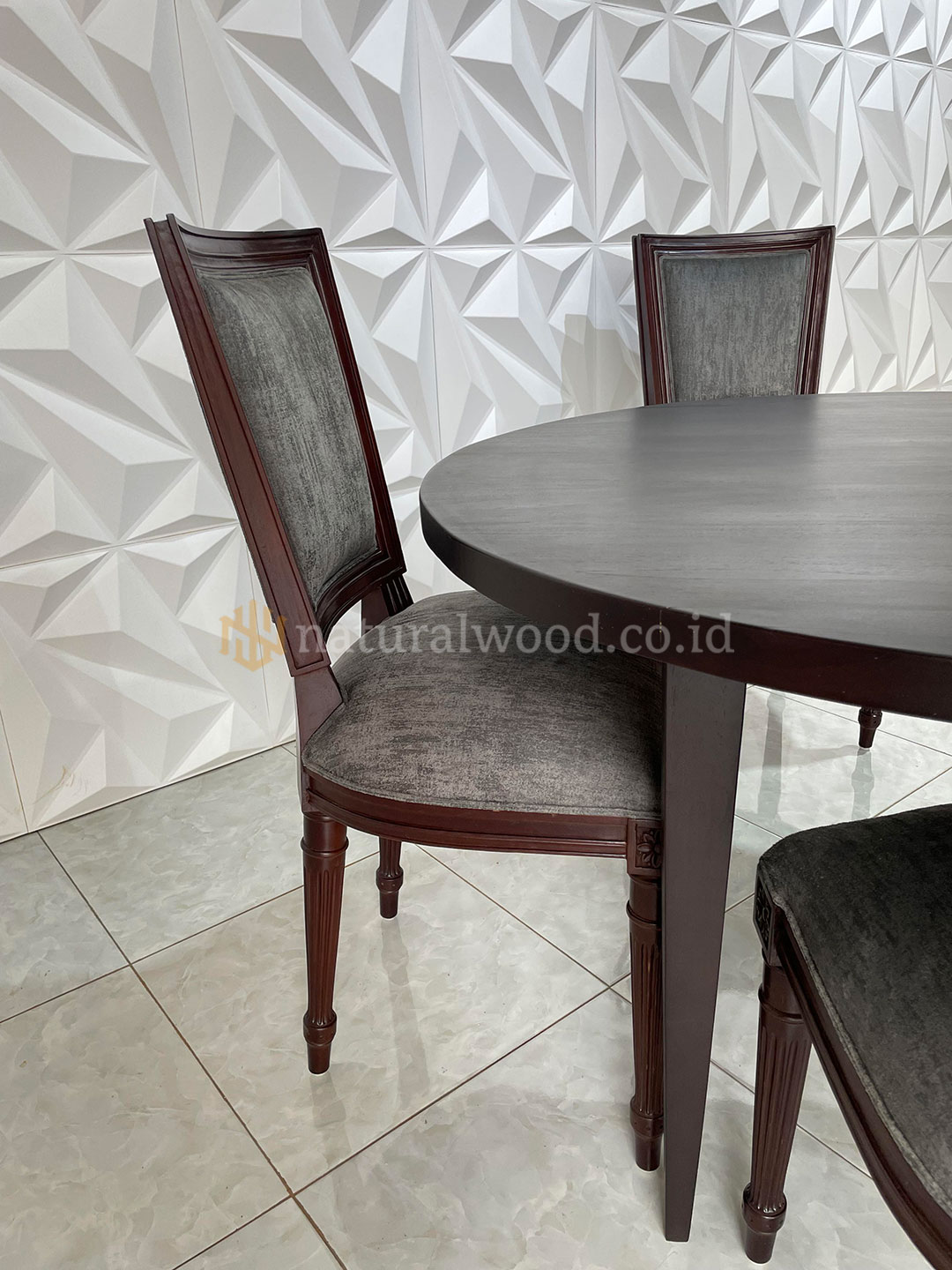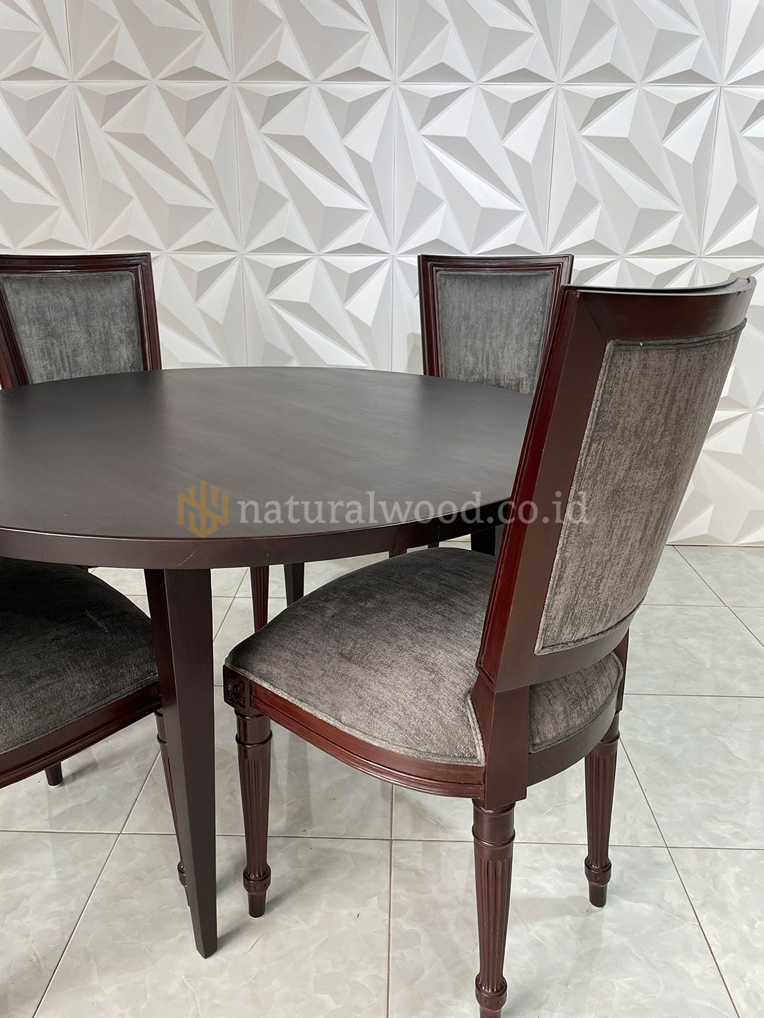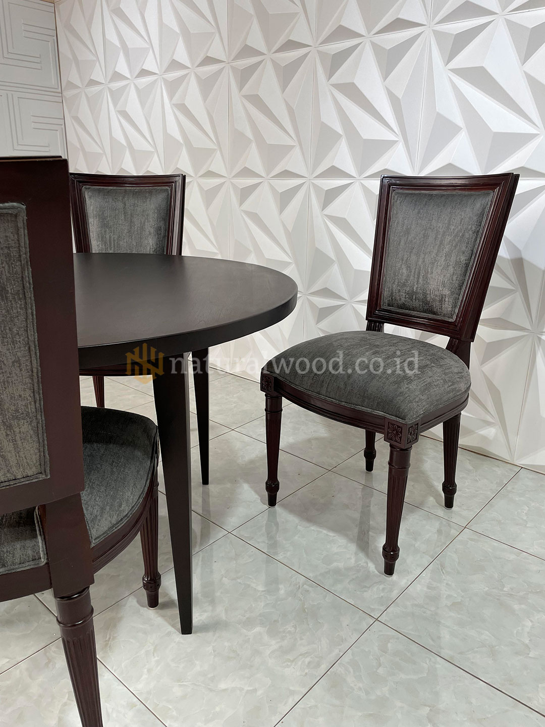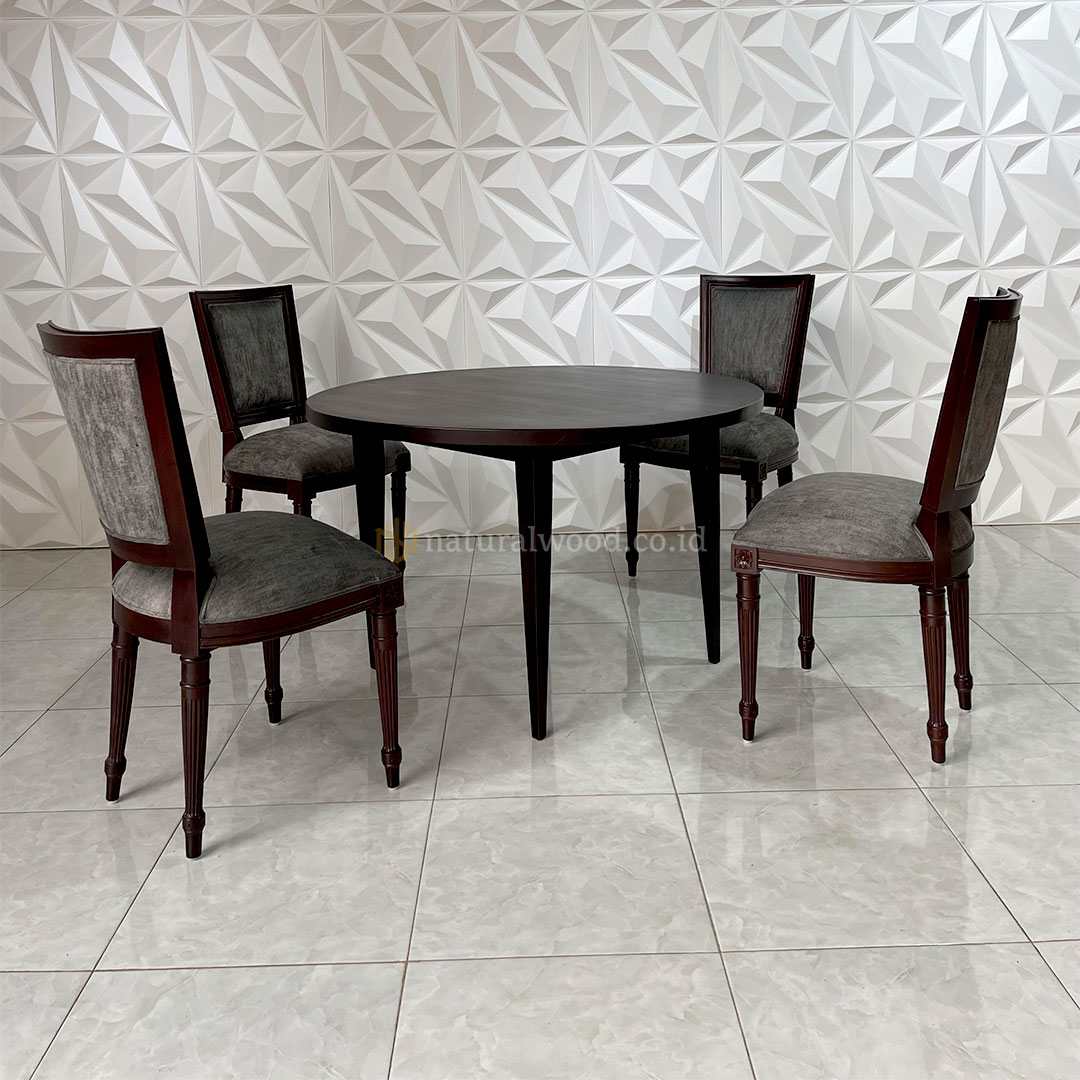 Set ini dilengkapi empat kursi berlapis kain lembut dengan rangka kayu jati yang kokoh, menghadirkan kenyamanan maksimal dan tampilan elegan. Finishing halus berwarna natural menonjolkan serat indah kayu jati, menciptakan kesan hangat sekaligus mewah di ruang makan Anda.
