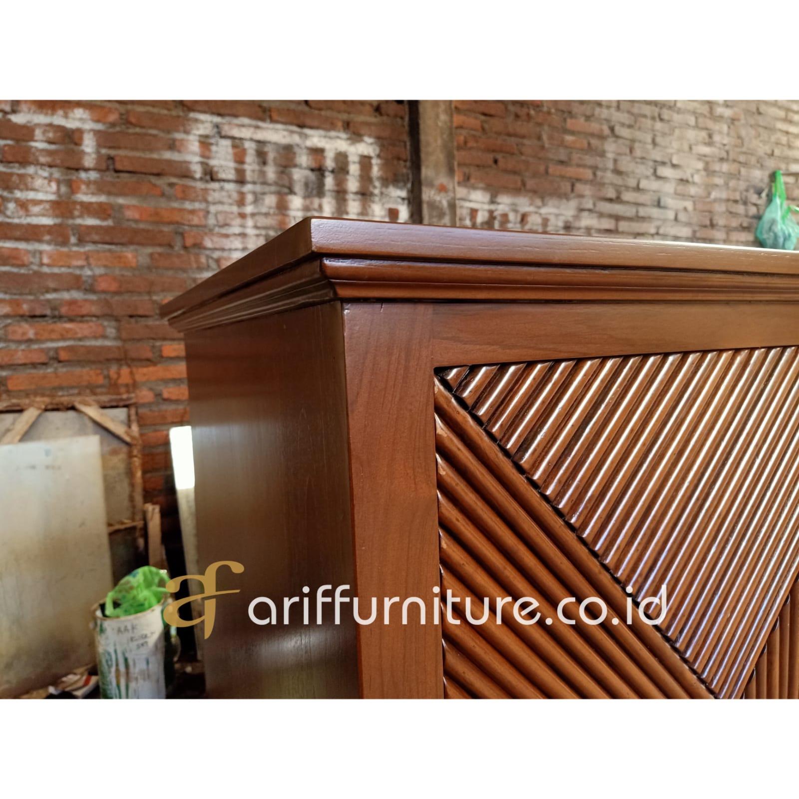 Dengan demikian, bufet meja TV minimalis modern dengan 2 pintu salur bukan hanya menawarkan kepraktisan dalam menyimpan perangkat elektronik, tetapi juga menjadi pernyataan estetika yang elegan. Dengan desain yang terintegrasi dengan baik, material yang berkualitas, dan penekanan pada keberlanjutan, bufet ini memenuhi kebutuhan fungsional dan gaya hidup modern tanpa mengorbankan nilai-nilai lingkungan.