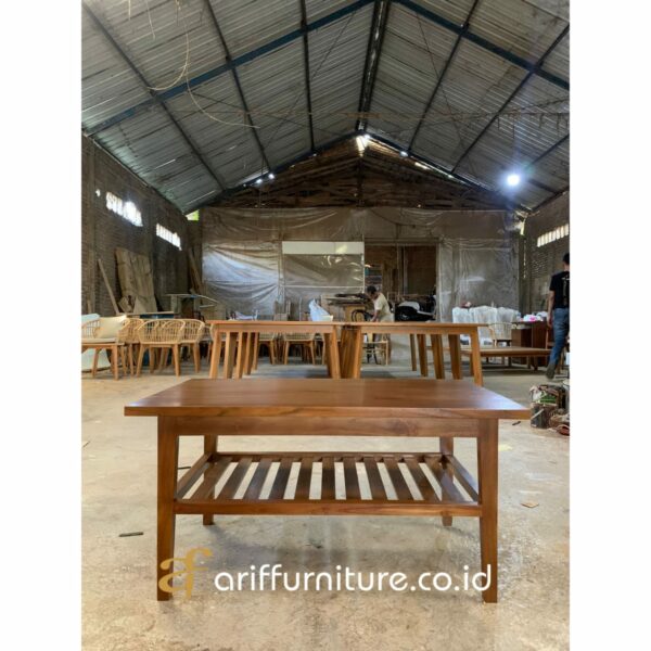 Dengan kayu jati yang menawarkan pesona alami, desain minimalis yang elegan, dan fungsionalitas yang berarti, meja ruang tamu sederhana ini menjadi pilihan yang sempurna bagi mereka yang menghargai keindahan yang berkelanjutan. Dengan menonjolkan kehangatan dan keramahan alami kayu jati, meja ini mampu menyeimbangkan estetika ruang tamu tanpa mengurangi ruang gerak atau kesan luas. Dengan adanya meja ini, ruang tamu akan menjadi tempat yang sempurna untuk bersantai, bersosialisasi, dan menikmati momen bersama keluarga dan teman-teman tercinta.