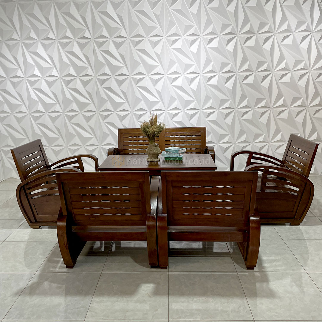 Produk ini dirancang dengan konsep minimalis ergonomis , menghadirkan kenyamanan saat digunakan untuk bersantai maupun menerima tamu. Set terdiri dari meja utama dan kursi dengan sandaran melengkung yang menambah nilai estetika serta kenyamanan duduk. Konstruksi kokoh hasil tangan terampil Furniture Jepara menjamin kualitas dan keawetan, bahkan untuk penggunaan jangka panjang.