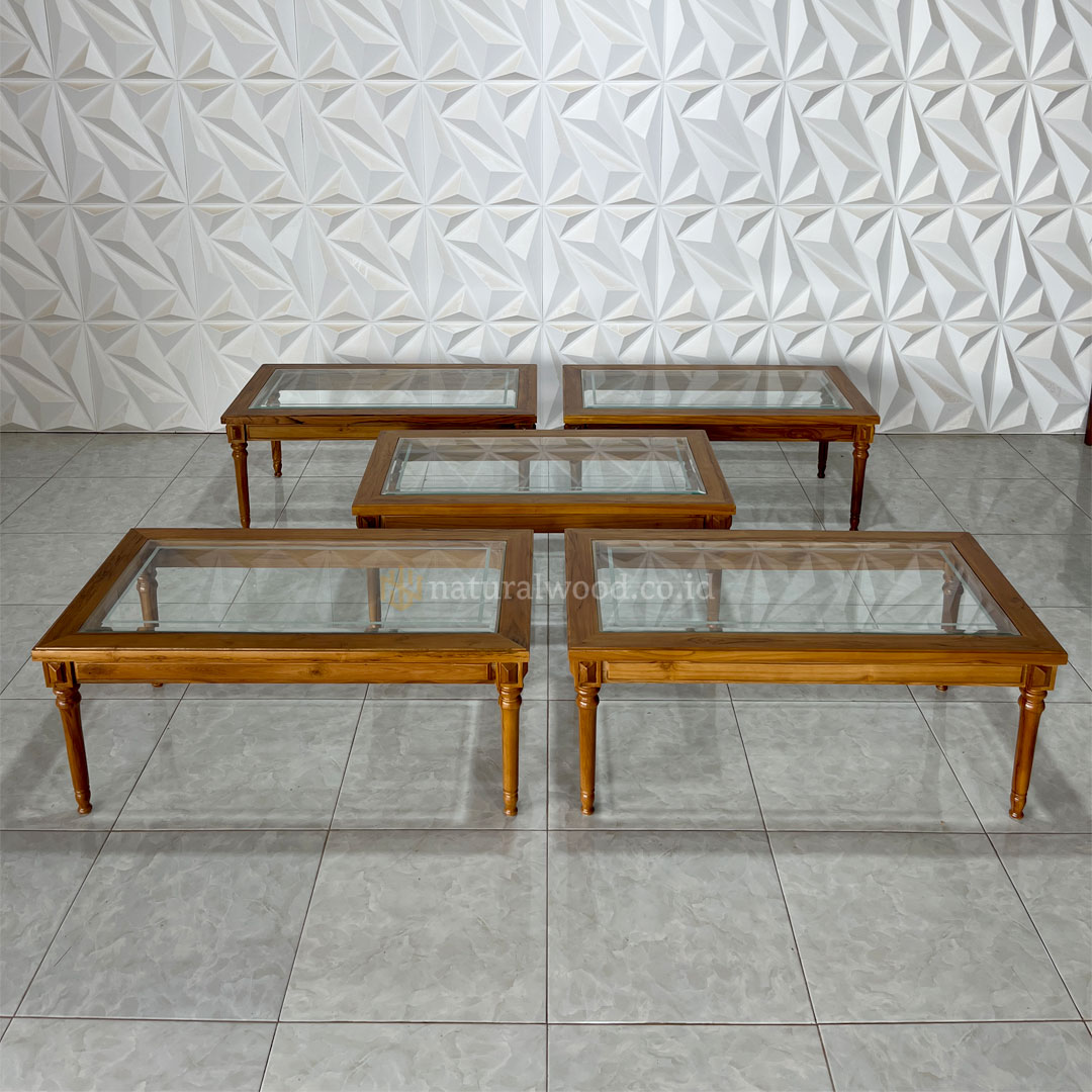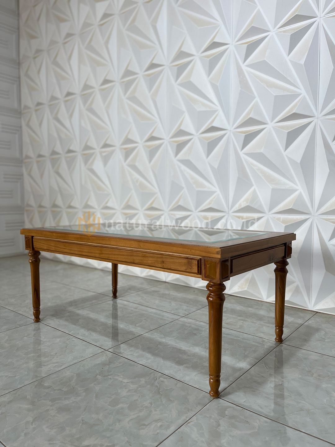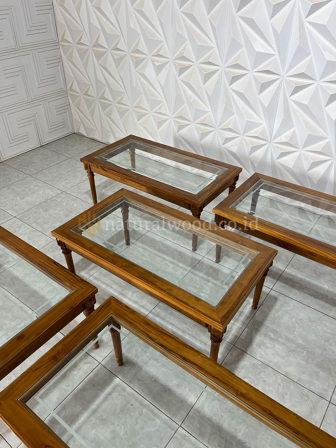 Bagian atas meja dilapisi dengan kaca tebal berkualitas premium yang memberikan tampilan elegan sekaligus melindungi permukaan kayu dari goresan atau noda. Finishing natural pada permukaan kayu mempertegas keindahan serat alami jati dan memberikan nuansa hangat serta alami pada ruang tamu Anda. Desain kaki meja yang ramping namun kokoh memberikan kesan ringan dan modern tanpa mengurangi kestabilan struktur.