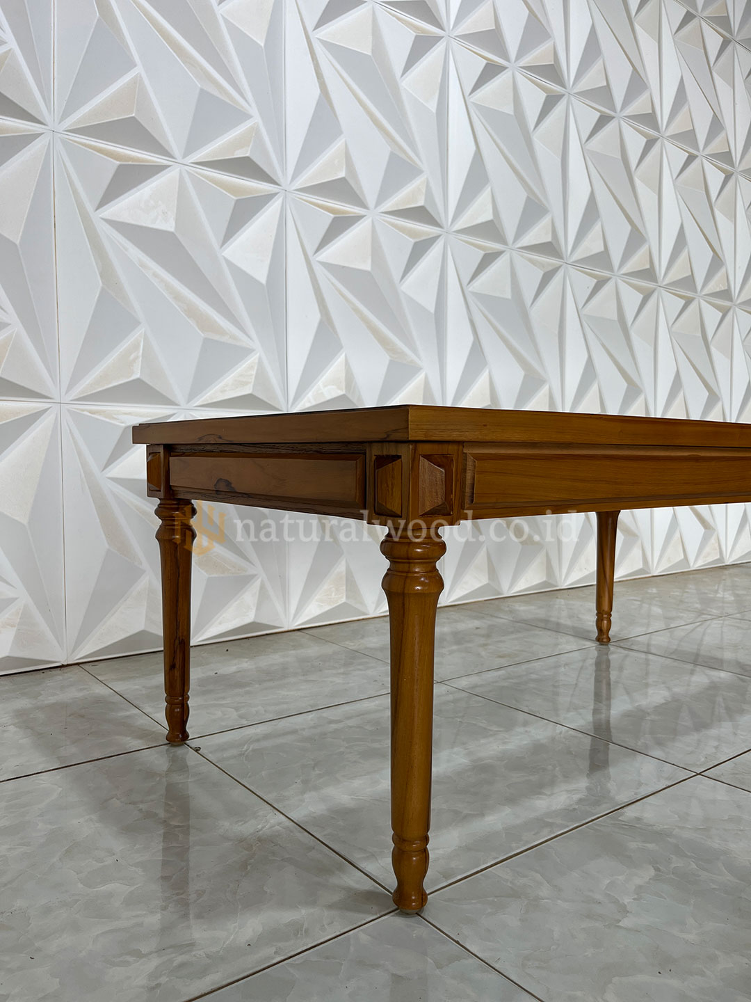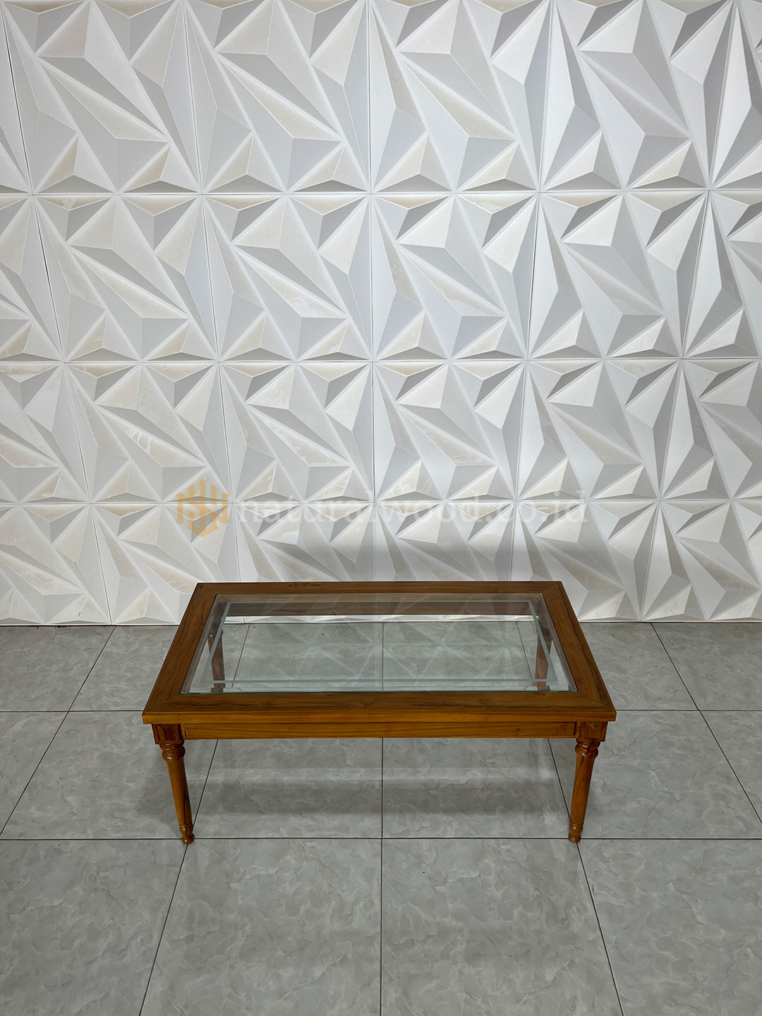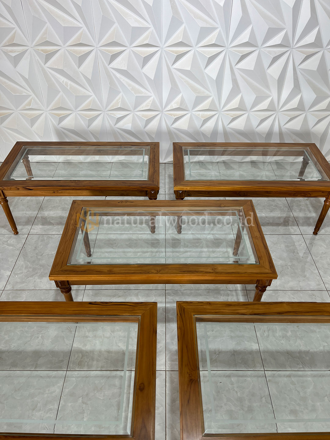 Bagian atas meja dilapisi dengan kaca tebal berkualitas premium yang memberikan tampilan elegan sekaligus melindungi permukaan kayu dari goresan atau noda. Finishing natural pada permukaan kayu mempertegas keindahan serat alami jati dan memberikan nuansa hangat serta alami pada ruang tamu Anda. Desain kaki meja yang ramping namun kokoh memberikan kesan ringan dan modern tanpa mengurangi kestabilan struktur.