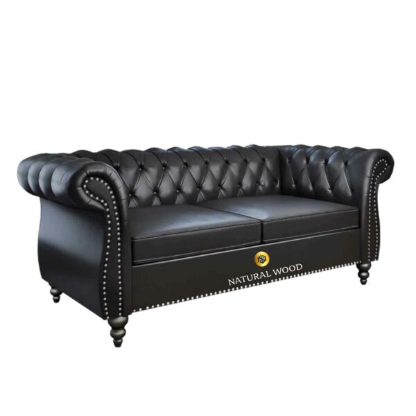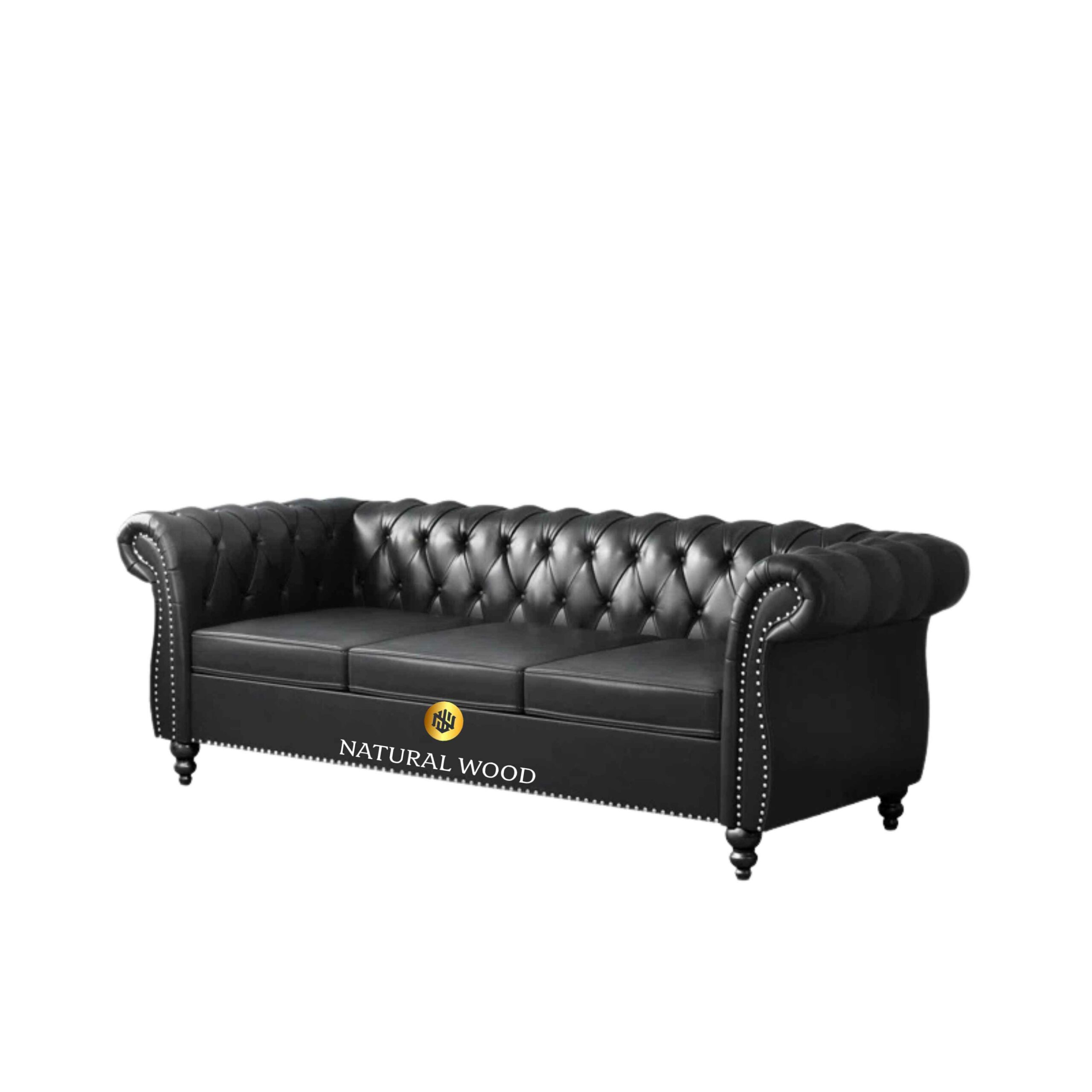 Dikenal dengan sandaran berumbai (deep button tufted) dan lengan bergulung (rolled arms), sofa Chesterfield memberikan tampilan mewah dan berkelas yang tak lekang oleh waktu. Ditambah sentuhan paku dekoratif di sisi-sisinya, menjadikan tampilan semakin kokoh dan detail.