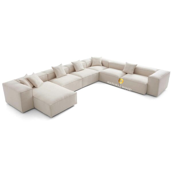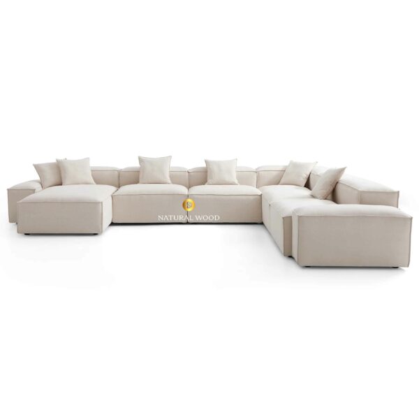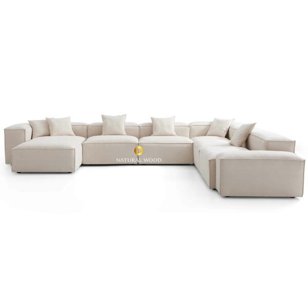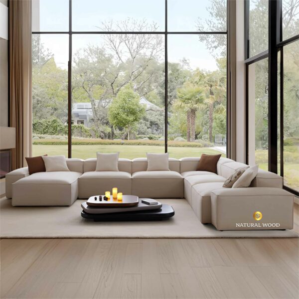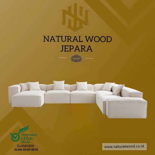 Didesain dalam bentuk U-Shape besar, sofa ini sangat cocok untuk ruangan yang luas dan terbuka. Modularitasnya memungkinkan penyusunan ulang sesuai kebutuhan tata ruang. Bentuknya yang tegas namun tetap lembut di mata memberikan kesan bersih, rapi, dan harmonis.