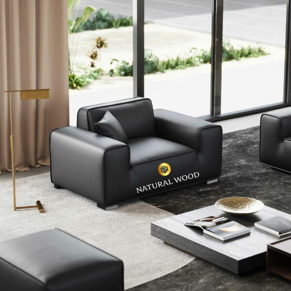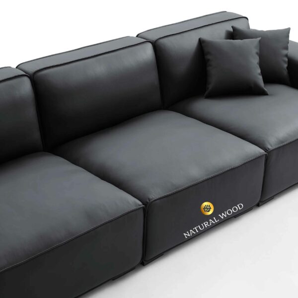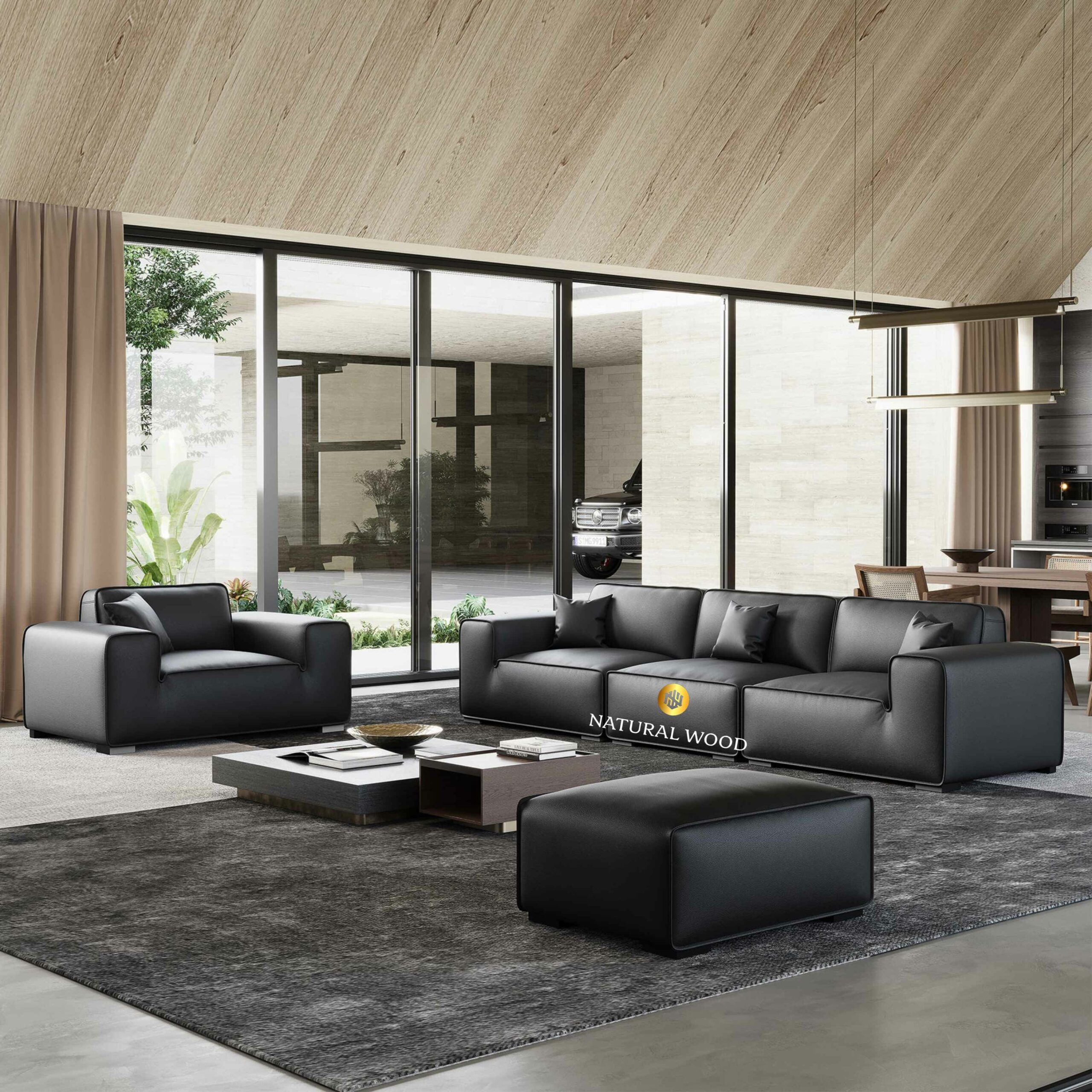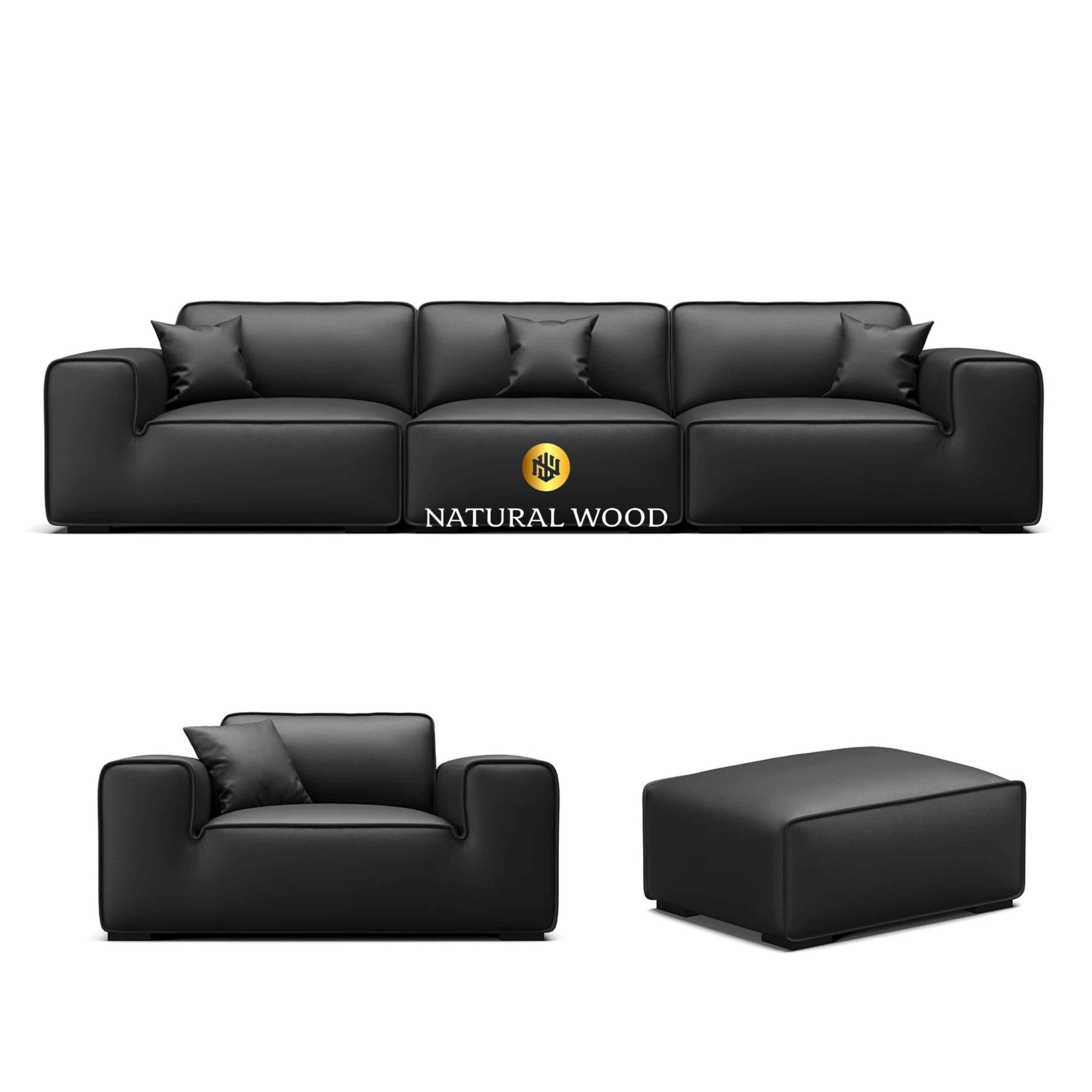 Dengan bentuk kotak yang tegas dan jahitan presisi, sofa ini menghadirkan nuansa kontemporer yang kuat. Desain modular 3 seater + 1 seater + ottoman memberikan fleksibilitas penataan, cocok untuk ruangan berkonsep minimalis hingga industrial modern.